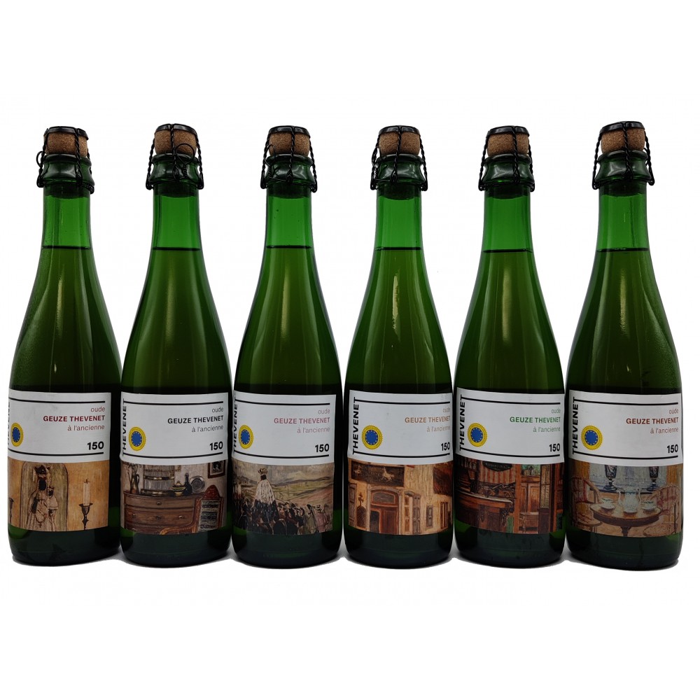 Pack with the 6 different labels. "In 2024, 150 years will have passed since the birth of Louis Thevenet; a famous painter from Halle. To celebrate this occasion, Brewery 'Den Herberg', in collaboration with 'den AST' and 'Villa Servais', developed a 'Geuze Thevenet.' It is a unique blend of eleven different barrels of lambic, aged in old (red and white) wine barrels made out of French and American oak. Kloris Devillé from Den Herberg describes the geuze as follows: "This 'Oude Geuze' has a lively palette of flavors, much like one might find in a masterful painting. The subtly woven minerality forms a canvas on which the depth of the composition is built, while the complexity of the geuze, thanks to the former red and white wine barrels, unveils a rich and varied palette of aromas and flavors, almost like masterful brushstrokes.". Six different labels were designed, each featuring a different painting by Thevenet from the collection of 'den AST'. This allows beer enthusiasts to simultaneously enjoy works such as 'Hôtel de Bruxelles', '’t Wit Paard', 'De Weg-Om', and 'Onze-Lieve-Vrouw van Halle onder stolp'. It's a little preview of the grand Thevenet exhibition, which will be on display on March 23 (2024), at 'den AST' and 'Villa Servais'.." Percentage of 3 YO old lambic is higher than in the Gueuze Devillé.