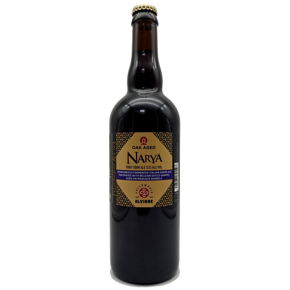 Fellowship 2024 Ale No 1. "Narya is a spontaneous fermented beer, where wort was added to Divico grapes from Winery Hoenshof in Belgium. After 7 months of maceration and fermentation, Narya was barrel aged on Chateau Siran Margaux barrels for another 6 months."