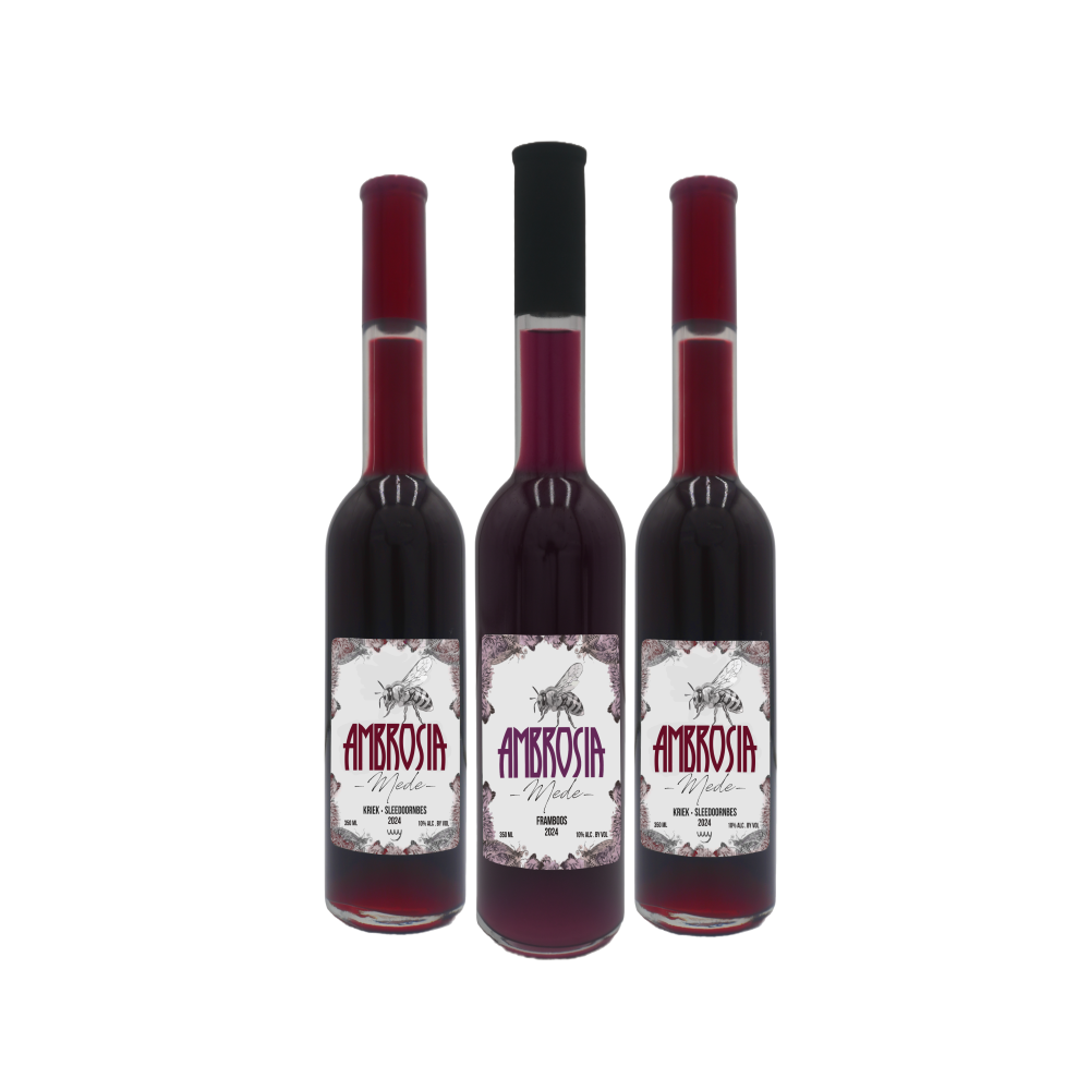 "Ambrosia is our side project - a mindset where we celebrate fruit at its peak ripeness and let honey weave it into something timeless. Boerenerf Meads brings together three 35cl bottles from our latest creations: two from the new batch of Ambrosia Kriek & Sloeberry, and one Ambrosia Raspberry. Each revealing its own harmony of natural sweetness and vibrant acidity. The result is a deep, complex, and intensely flavorful experience that captures the rustic charm and rich character at the heart of Ambrosia. Best enjoyed with other sweet people ;)."