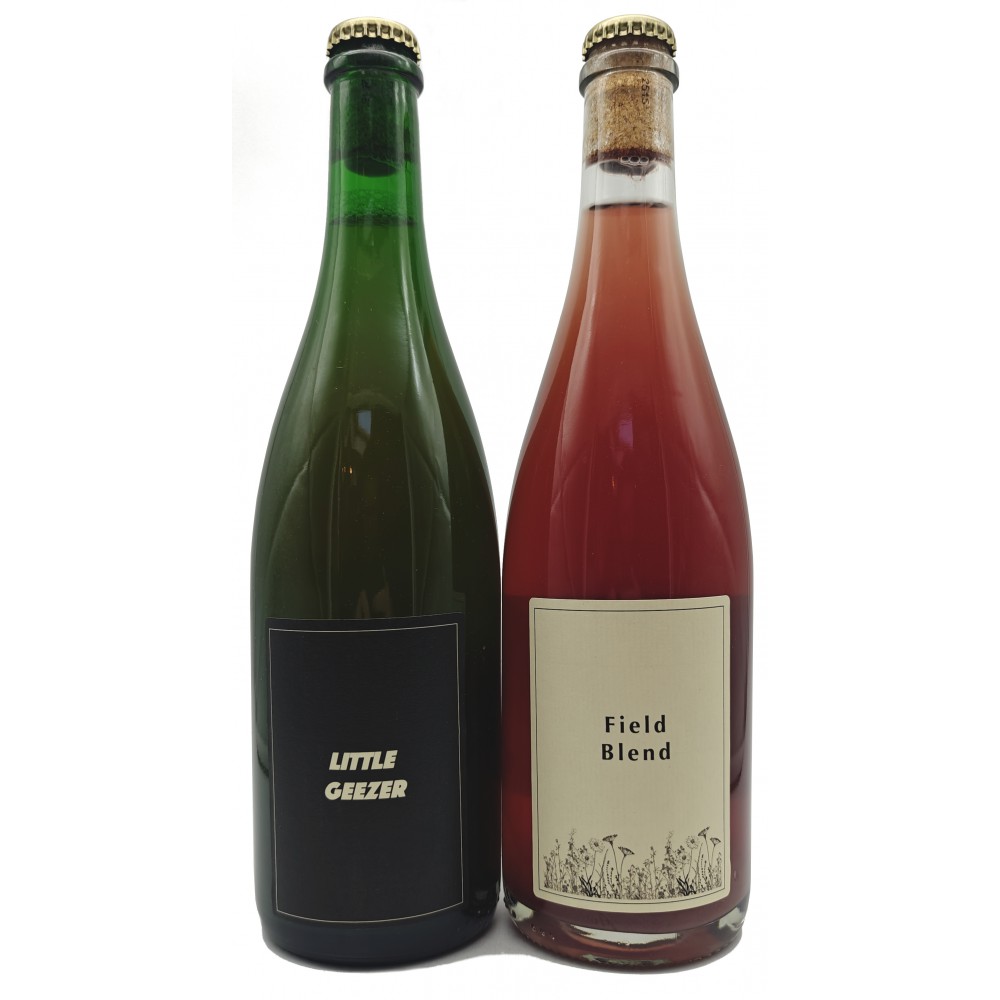 Pack Containing 2 bottles from Pellicle: Litlte Geezer ("Blend of 3 different barrel aged lambics of 24 months to 35 months old. This Geezer does not contain beer of 1 or 3 years or older.") and Field Blend ("Ex red wine barrel aged ciders from 2024 macerated on Gamay, Pinot Noir, Chenin, Grolleau and Müller Thurgau grape skins. ")