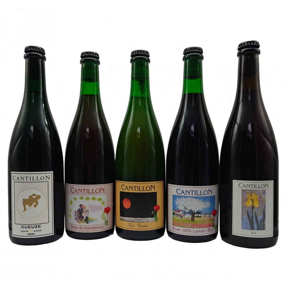 Pack containing 5 bottles of Cantillon bottled in 2023: Gueuze, Fou Foune (Lambic with Apricots), Kriek, Iris & Rosé de Gambrinus (Lambic with raspberries)