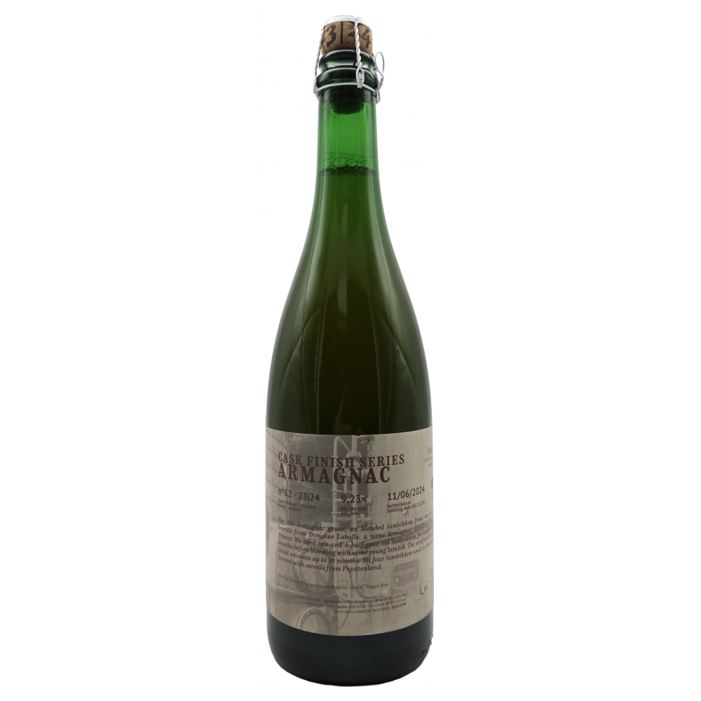 Season 2023-2024 Assemblage #52. Bottles on 11/6/2024. "For this Armagnac geuze, we blended lambikken from two small Armagnac barrels from Domaine Laballe, a nano Armagnac distillery from Paerleboscq, France. We aged two-and-a-half-year old lambikken for another good nineteen months before blending with some young lambik. The weighted average age of the blend amounts up to 36 months. All four lambikken used in this blend, have been brewed with cereals from Pajottenland."