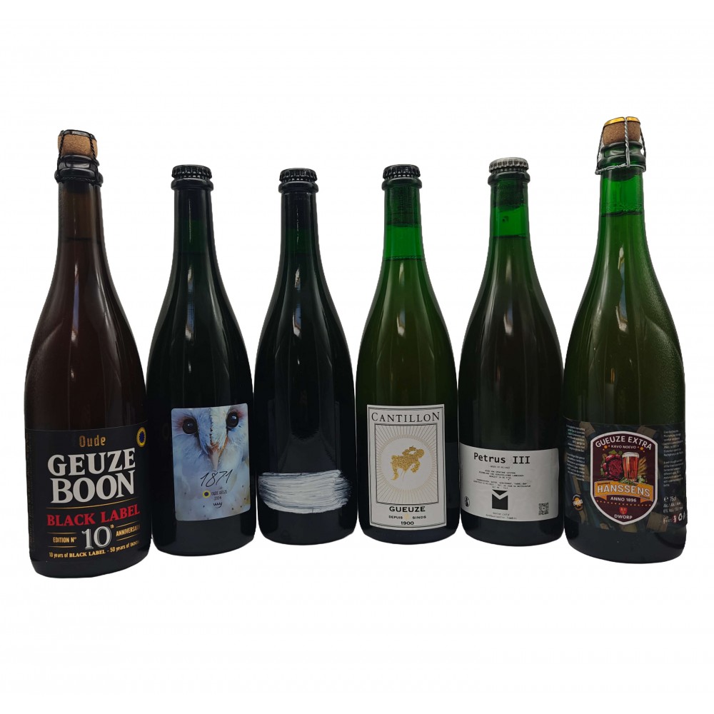 Pack consisting of six bottes of Gueuze that we are loving right now, and so we are offering them in a pack with a 10% discount. From Left to right: Boon Oude Gueuze Black Label n°10, Boerenerf Oude Gueuze 1871, Cantillon Gueuze 125, Gueuze Cantillon 2025, Vermeersch Petrus III & Hanssens Gueuze Extra