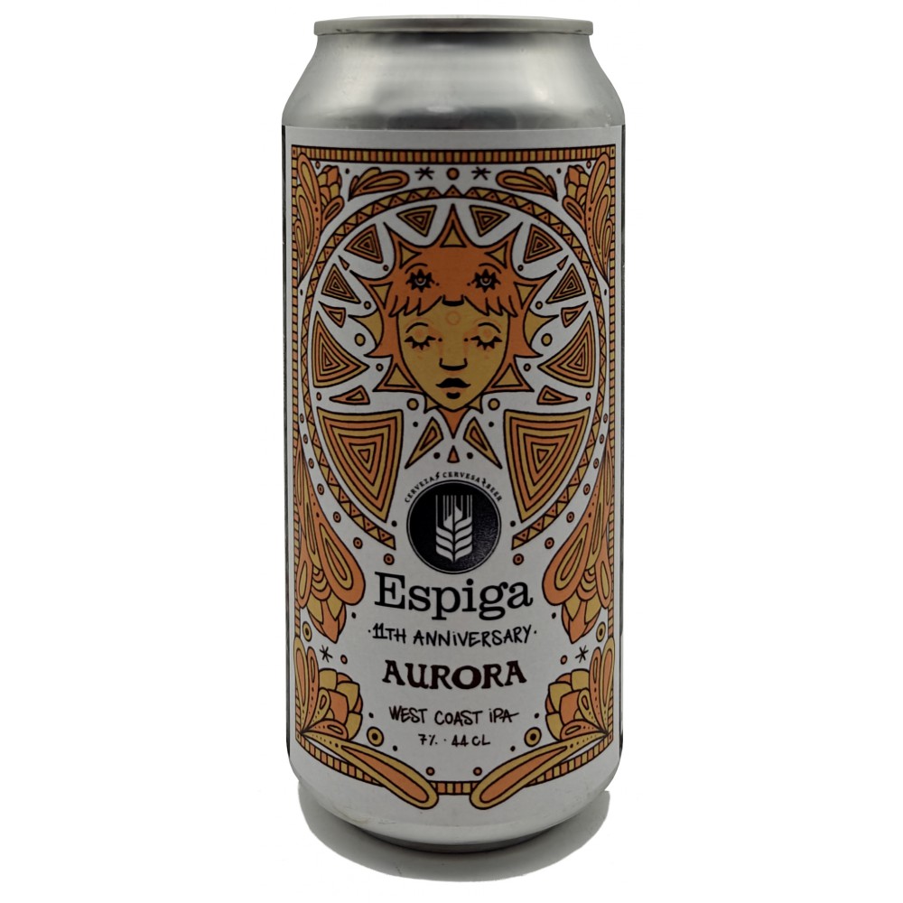 "Aurora is a 7% ABV West Coast IPA, brewed to celebrate Espiga's eleventh anniversary. Its bright golden color is reminiscent of the sun that gives us life. The nose features an intense and fresh profile of Zappa, Mosaic, Centennial, and Citra hops, with herbal, citrus, and fruity aromas. The palate is light and flavorful, with a clean, balanced bitterness that invites you to keep drinking. A vibrant and festive beer, perfect for toasting and giving us energy to keep going around the sun."