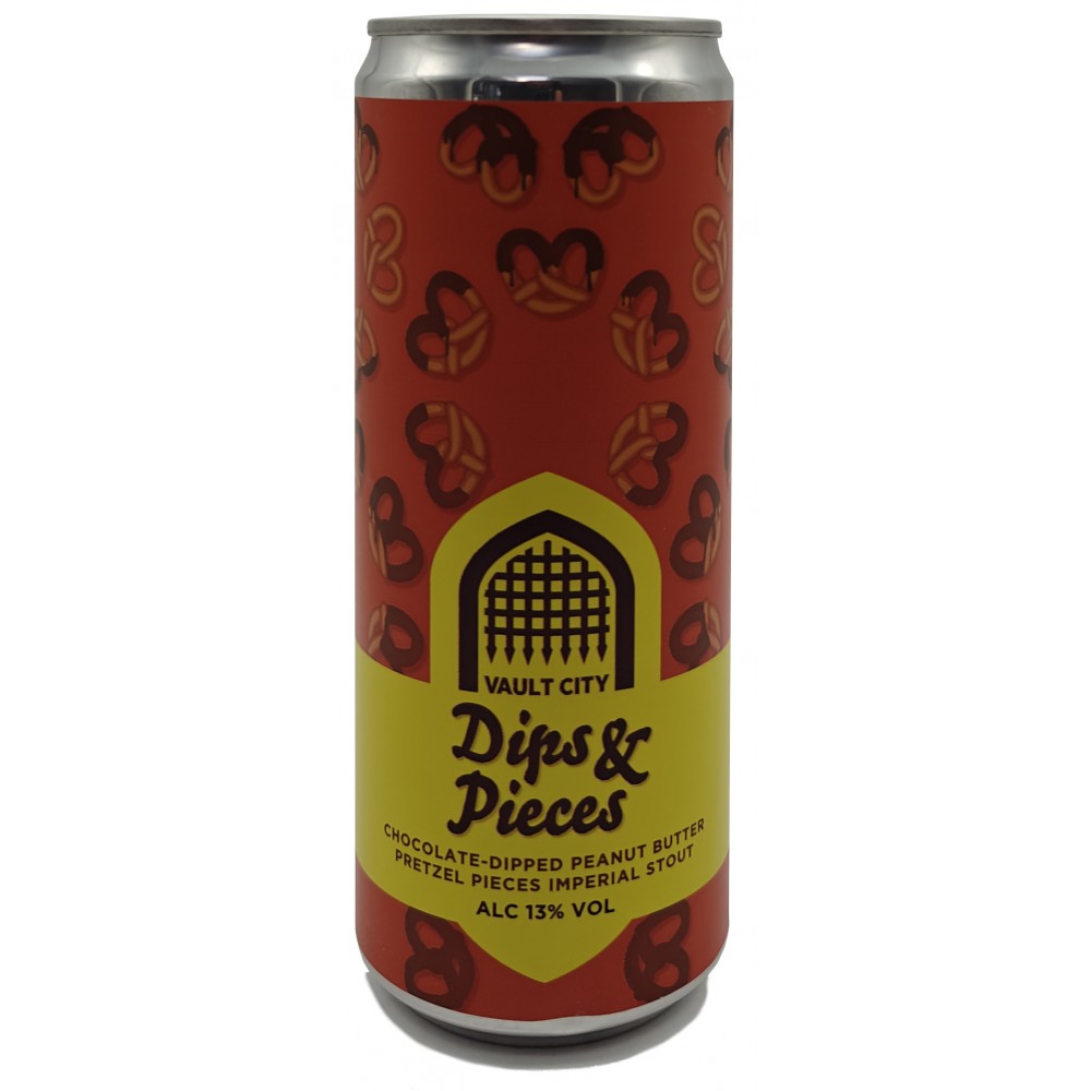 "Inspired by the irresistible combo of peanut butter–coated pretzels dipped in rich chocolate, Dips & Pieces is a rich and indulgent imperial pastry stout. This recipe features a layered malt bill of Carafa Special III, Melanoidin, Chocolate Malt, Wheat and Oats for a sticky, full-bodied stout with intense roasted dark chocolate notes enhanced by mountains of cacao nibs."